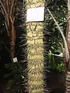 Palma de 1 a 8 m de altura, los tallos solitarios y delgados de 10 cm de diámetro, monocaule de hasta 8 cm de grueso con espinas planas, fuertes, negras, de 3-6 cm de largo, arregladas en verticilos regularmente distribuidos en el tallo. Los prófilos (hojas jóvenes) son simples, los gnomófilos (hojas maduras), son hojas compuestas, alternas, agrupadas al final de los tallos, hasta 1 m de largo o más, arqueadas, con 15 a 32 pares de pinnas por lado, las apicales a menudo no partidas y con márgenes dentados; pecíolo y raquis con numerosas espinas aciculares hasta de 5 cm de largo. Inflorescencias panículas erectas, con una bráctea peduncular de 15 a 30 cm de largo, ramas florales con una flor femenina en la base. Frutos de 4–6 cm de diámetro, elipsoides a obovoides, cafés, cubiertos de espínulas cortas y negras, con una sola semilla[5] y flores masculinas agrupadas en el ápice, Espata muy espinosa, frutos globosos de 4 cm de largo, marrones y espinosos, el endosperma es comestible. Las semillas tardan 2 meses en germinar.