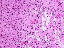 Histopatológicamente, las células tumorales presentan una disposición angiocéntrica en una matriz mixoide. No hay un patrón de crecimiento bifásico típico como en los astrocitomas pilocíticos, ni son características las fibras de Rosenthal o los cuerpos granulares eosinófilos. Las mitosis son raras. La actividad proliferativa puede oscilar entre el 2% y el 20%.