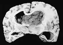 Se trata de un tumor de crecimiento lento, que frecuentemente se origina en la pared de los ventrículos, pero cuando se localiza en la proximidad de un agujero interventricular puede obstruir el flujo del líquido cefalorraquídeo, formando hidrocefalia.[2][3]