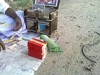 Los periquitos son entrenados específicamente para este tipo de trabajos. Un loro astrólogo o adivino normalmente se sitúa por debajo de un árbol o al lado de una carretera, donde las personas se congregan en cantidad. Los domadores tienen una caja que contiene uno o dos loros entrenados. Tanto el tarot como las tarjetas son apiladas y organizadas delante de la persona. Son en total 27 números que representan el sistema cósmico indio. Cada ficha contiene la imagen de una deidad hindú y algunas tarjetas contienen imágenes de Buda o la Virgen María con el Niño Jesús.