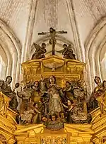 El retablo que cobija el relieve es de un cuerpo con una sola calle, banco, ático y altar. La calle se compone de una hornacina de medio punto presidida por el altorrelieve de la Asunción de la Virgen. El arco de esta hornacina se apoya en pilastras enteramente cubiertas de rocalla y rematadas por capiteles decorados con los rostros en relieve de dos ángeles, estando el arco coronado a su vez por el rostro de un ángel de mayor tamaño cercado por volutas. Enmarcando el conjunto y a distinto nivel horizontal destacan dos estípites ricamente ornamentados con relieves de guirnaldas y rocalla, rematados en la zona superior con capiteles corintios. El banco se halla presidido por la cabeza de un serafín cubierta de rocalla y custodiada por el relieve de dos volutas al igual que el ángel ubicado sobre la Asunción. Por su parte, el ático, también cercado por volutas, alberga una estructura rectangular rematada con un perfil mixtilíneo y decorado con guirnaldas, todo ello enmarcando un altorrelieve obra de Mesa[6] en el que se representa la Coronación de la Virgen, quien figura con ambas manos sobre el pecho y un grupo de cabezas de querubines a sus pies. Dios Padre se sitúa a la derecha pisando la bola del mundo y mostrando un triángulo sobre su cabeza, símbolo de la Santísima Trinidad, completada a la izquierda por la figura de Jesús portando la Cruz y arriba en el centro por el Espíritu Santo bajo forma de paloma presidiendo un resplandor entre dos nubes.