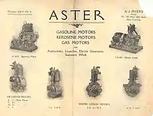 - Aster brochure of Myers, New York, 1900s. Listing Stationary motors; Electricity generator; Air cooled range; Water cooled range; and listing Gasoline motors, Kerosene motors and Gas Motors for Automobiles, launches, Electric generators and stationary work. Distributed in the USA by 'A J Myers', New York.