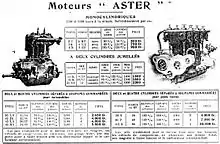 En el Salon de l'Auto de 1900 en París, Aster expuso un cuatriciclo equipado con un motor monocilíndrico de 3,5 CV de fabricación propia.[15] La gama en expansión incluida : motores estacionarios; generadores eléctricos; motores de automóvil y motores marinos para lanchas. Había motores de gasolina refrigerados por aire y por agua, motores de queroseno y motores de gas.[16]