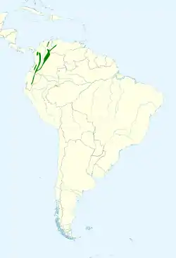 Se encuentra en los bosques húmedos andinos desde el oeste de Venezuela hasta el Perú, pasando por Colombia y Ecuador.