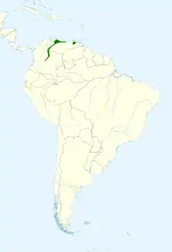 Se encuentra únicamente en las montañas del noreste de Colombia y norte de Venezuela. Su hábitat natural son los bosques húmedos tropicales de montaña.