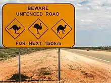 En los EE. UU., las secciones de la carretera que se sabe que tienen mucho tráfico cruzado de ciervos generalmente tendrán señales de advertencia que representan un ciervo saltando; existen signos similares para alces, alces y otras especies. En el oeste americano, las carreteras pueden atravesar grandes áreas designadas como " campo abierto ", lo que significa que no hay cercas que separen a los conductores de los animales grandes como el ganado o el bisonte . Un conductor puede tomar una curva para encontrar una pequeña manada parada en el camino. Las áreas de campo abierto generalmente están marcadas con letreros y protegidas por un guardia de ganado .