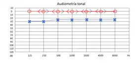 · La audición por vía aérea es representada en ambos ojos con un círculo por el oído derecho (O), mientras que una "X" azul para el oído izquierdo.