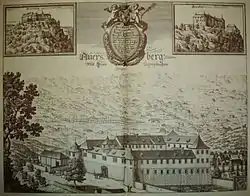 "ANNO DOMINI 1067 IAR IST AURSPERG DURCH HERN CONRAT VON AUERSPERG ANGEFANGEN ZU PAUN NACHMALS DURCH DEN ERTPUDEM IM 1511 IAR ZERSCHVT ABER DURCH MICH TROIAN VON AUERSPERG OBRISTIN ERB CAMRER IN CRAIN UND DER WINDISCHEN MARK IN GRUND ABGEPROCHEN UND VON NEUEN ANGEFANGEN ZU PAUEN IM 1520 IAR". "En el año del Señor 1067, Konrad von Auersperg inició la construcción de Auersperg. Posteriormente fue destruido por el terremoto de 1511, y por mí, Trajan von Auersperg, chambelán principal de Carniola y la la Windischen Mark, demolido hasta los cimientos y empezado a cosntruir de nuevo en 1520."