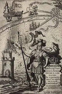 Ese mismo año en Madrid salió, de las prensas de Julián Paredes, España triunfante y la Iglesia laureada en todo el globo de el mundo de fray Antonio de Santa María O. C. D., con frontispicio calcográfico firmado, castellanizando el nombre, «Augustin Bouttats, sculpt Md». El grabado, una alegoría de España con coraza all'antica, enarbolando un estandarte en el que campea la imagen de la Inmaculada Concepción, encontró su intérprete en un anónimo de la escuela cuzqueña que le dio color y pasó a lienzo.[5]