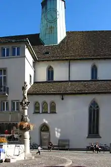 La iglesia agustina se transformó durante la Reforma en Zürich en un taller secular, y sirvió como ceca y espacio de almacenamiento. Desde 1596 hasta 1841, su coro sirvió como residencia del distrito de la ceca y del maestro de la ceca, y en la "Jakobskapelle", los maestros de la ceca armaron sus troqueles en relieve. Por lo tanto, el Münzplatz fue llamada así después de que la ceca estuviera en el coro.[6] El llamado Folderbrunnen fue construido en 1537 como pozo de agua para la localidad y sigue siendo un punto de encuentro popular entre locales y turistas.[7]