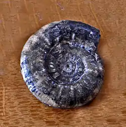 ![]() Concha fósil de Rasenia cymodoce de Calvados (Francia), en exhibición en la Galerie de paléontologie et d'anatomie comparée en París | ||