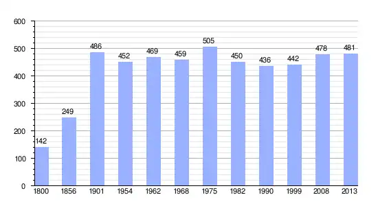 Los datos demográficos contemplados en este gráfico de la comuna de Aumontzey[4] se han cogido de 1800 a 1999 de la página francesa EHESS/Cassini, y los demás datos de la página del INSEE.[5]