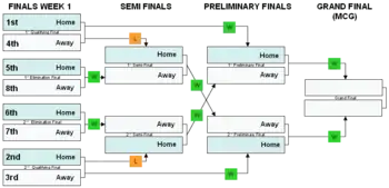 La fase final es de eliminación directa a partido único. Los cuatro primeros clasificados juegan las "rondas clasificatorias" (primero contra cuarto, segundo contra tercero), mientras que del quinto al octavo juegan "rondas eliminatorias". Los vencedores se meten en las finales previas, mientras que los perdedores juegan contra los ganadores de las eliminatorias. La siguiente ronda son las semifinales, y después se juegan las finales previas. El ganador de cada final preliminar juega la final por el título (Grand Final), que se disputa a finales de septiembre. En caso de empate, se repite el partido una semana después. El campeón de la final recibe la bandera y el título de campeón (Premiership Cup).[5]