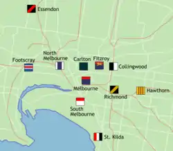 En 1896, varios equipos de la VFA rompieron su relación con la asociación y crearon su propio campeonato, que se disputó en los meses de invierno.[20][21] La Victorian Football League' (VFL) se constituyó oficialmente en 1877, con todos sus clubes procedentes de Melbourne y su área metropolitana, una situación que perduró hasta 1982. Los fundadores de la liga fueron Carlton, Collingwood, Essendon, Fitzroy, Geelong, Melbourne FC, St Kilda y South Melbourne.[21]