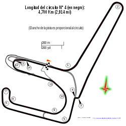 Circuito N° 1 3.120 Circuito N° 2 4.700 N° 3 modificaciones 3.140, 3.200 (modificados), 3.117.40 (años 1992 y 1993), Circuito N°3 2550 metros y Circuito N°4 3.518 metros km | |
