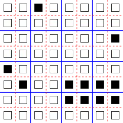 El esquema de partición más simple es probablemente la vecindad de Margolus, nombrado después de que Norman Margolus, quién fue el primero en estudiar autómata celular de bloque utilizando esta estructura de vecindad. En la vecindad de Margolus, el enrejado está dividido a bloques de 2 células (o 2 × 2 × 2 × 2 cuadrada en dos dimensiones, o 2 2 × 2 × 2 2 2 × 2 2 cubos en tres dimensiones, etc.) cuáles están cambiados por una célula (a lo largo de cada dimensión) encima alternar pasos de tiempo.[1][2][3]