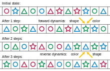 - La dinámica invertida en el tiempo del autómata puede ser descrita por otro autómata celular. Claramente, para que esto sea posible, la regla de actualización debe ser biyectiva. En la otra dirección, si la regla de actualización es biyectiva, entonces tiene una función inversa que también es biyectiva. Esta función inversa debe ser una regla de autómata celular.