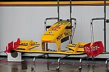 Los primeros diseños unían los alerones directamente a la suspensión, pero varios accidentes hicieron que las normas establecieran que los alerones debían estar fijados de forma rígida al chasis. La aerodinámica de los coches está diseñada para proporcionar la máxima carga aerodinámica con un mínimo de resistencia; cada parte de la carrocería está diseñada con este objetivo. Al igual que la mayoría de los coches de ruedas abiertas, cuentan con grandes alerones delanteros y traseros, pero están mucho más desarrollados que los de los coches de ruedas abiertas estadounidenses, que dependen más de la puesta a punto de la suspensión; por ejemplo, el morro está elevado por encima del centro del alerón delantero, lo que permite que toda su anchura proporcione carga aerodinámica. Los alerones delanteros y traseros están muy esculpidos y se han afinado al máximo, al igual que el resto de la carrocería, como las aletas de giro bajo el morro, los bargeboards, los sidepods, los bajos y el difusor trasero. También cuentan con apéndices aerodinámicos que dirigen el flujo de aire. Este nivel extremo de desarrollo aerodinámico significa que un coche de F1 produce mucha más carga aerodinámica que cualquier otra fórmula de ruedas abiertas; los Indycars, por ejemplo, producen una carga aerodinámica igual a su peso (es decir, una relación carga aerodinámica:peso de 1:1) a 190 km/h (118 mph), mientras que un coche de F1 logra lo mismo a 125 a 130 km/h (78 a 81 mph), y a 190 km/h (118 mph) la relación es de aproximadamente 2:1.[27]