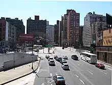 Luego, la autopista continúa hacia el norte como la avenida Dyer, una calle dividida de cuatro carriles, por una cuadra. En 31st Street, hay un semáforo y la autopista continúa hacia el norte por debajo del desarrollo de Manhattan West y las calles locales como una carretera separada por niveles. La carretera pasa por debajo de la calle 33, donde una rampa de entrada y salida hacia y desde el Túnel Lincoln desciende desde la calle 33 hasta la mediana de la carretera subterránea, fusionándose con las respectivas direcciones de tráfico. La Autopista del Túnel Lincoln pasa por debajo de las calles locales durante tres cuadras más. En la calle 36, las rampas conducen hacia y desde la autopista en dirección sur, mientras que una rampa desde la avenida Dyer en dirección norte y Ninth Avenue en dirección sur se une a la autopista en dirección norte. [3] [4]