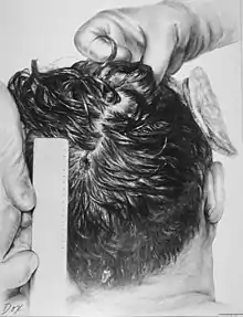 - La herida grande y de forma irregular en el lado derecho de la cabeza (principalmente en el hueso parietal, pero que también afecta al hueso temporal y occipital) se describe como de unos 13 centímetros (5,1 plg) ancho en el diámetro más grande. [10]