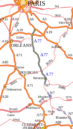 La autoroute A77 comienza en Poligny en Seine-et-Marne, en el intercambiador de interconexión con la autoroute A6 ; esta termina en Sermoise-sur-Loire en el departamento de Nièvre, donde se prolonga por la route nationale 7.