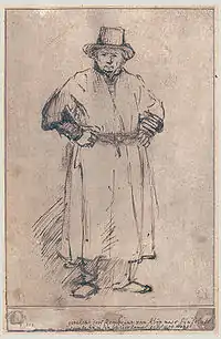 En el lienzo se puede visualizar pinceladas libres y sueltas especialmente en las prendas de vestir, las cuales incluyen un guardapolvo marrón que posiblemente era su traje de trabajo, el cual está atado con una faja y sobre un jubón negro de cuello alto. Un dibujo de alrededor de 1650 muestra a Rembrandt en una postura y con un traje muy similar y contiene una inscripción, aunque no de la mano de Rembrandt, que establece que estas fueron las ropas de trabajo del pintor. En el dibujo se ve a Rembrandt con un sombrero de copa mientras que en la pintura utiliza una boina negra, la cual era común en los retratos de los artistas del siglo XVI.[2]