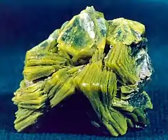 La autunita (fosfato uranil cálcico hidratado) y fórmula: Ca(UO2)2(PO4)2·10-12H2O puede ser de color amarillo o raramente verde como la torbernita y en algunos casos puede tener un brillo vítreo .Es un mineral descubierto por primera vez en Francia en localidad francesa de Autun, y de esa localidad recibió su nombre. Tiene cristales tabulares y a veces también de contorno rectangular u octagonal y siempre se presentan en grupos unidos, bastante compactos y grandes. Los cristales de autunita tienen exfoliación y a veces son escamosos. Raramente se presentan dispersos y no en grupos gruesos.