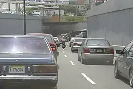 ![]() Tránsito en uno de los pasos a desnivel de la Av. 27 de Febrero en Santo Domingo. | ||
