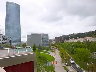 ![]() Panorámica de la avenida Abandoibarra en dirección al parque de la Campa de los Ingleses desde el Museo Guggenheim Bilbao. | ||