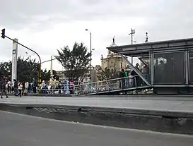 La estación de intercambio Avenida Jiménez hace parte del sistema de transporte masivo de Bogotá, TransMilenio, inaugurado en el año 2000.