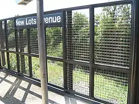 La estación New Lots Avenue (Avenida New Lots) es una estación de dos vías y dos plataformas laterales. Las plataformas se conectan, y las salidas están localizadas en el centro de ambas plataformas.