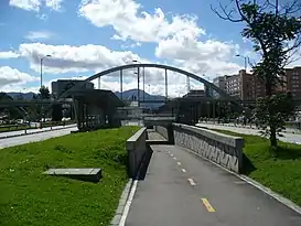 La estación intermedia Avenida Rojas forma parte del sistema de transporte masivo de Bogotá, TransMilenio, inaugurado en el año 2000.