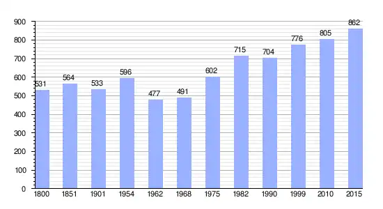 Los datos demográficos contemplados en este gráfico de la comuna de Avernes[4]se han cogido de 1800 a 1999 de la página francesa EHESS/Cassini, y los demás datos de la página del INSEE.[5]