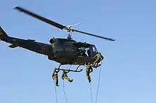 Soldados haciendo rapel desde un UH-1H de la Fuerza Terrestre de Autodefensa de Japón.