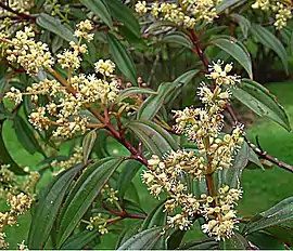 Alcanza entre 3 y 8 m de altura. Hojas firmes, con pecíolo de 1,5 a 3,5 cm de longitud, lámina cartácea o subcoriáce, elíptica a obovada, de 6 a 16 cm de longitud por 2 a 9 cm de ancho, glabras, con limbo ligeramente revoluto en la base. Inflorescencias semicorimbosas y submultifloras de 4 a 6 cm de largo, en cortos ramitos. Flores en forma de campanilla, con pétalos a medio abrir, obovados de 8 a 14 mm de largo, blancos o exteriormente rosados a lilas; tecas de 5 a 7 mm, moradas a negruzcas. Fruto en cápsula, semigloboso de 11 mm de diámetro; semillas angostas oblongo piramidales.[4]