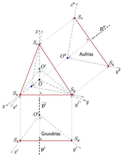 Una proyección paralela ortogonal queda unívocamente determinada especificando la dirección de proyección . El plano del dibujo es perpendicular a la dirección de proyección y se puede deslizar a lo largo de la dirección de proyección como se desee sin alterar el resultado del dibujo. Para obtener una imagen vívida del objeto espacial, se debe elegir una dirección de proyección que no sea paralela ninguno de los tres ejes de coordenadas. Por lo tanto, los tres ejes de coordenadas intersecan el plano del dibujo en los puntos de referencia . Con la elección de un punto de referencia, los otros dos quedan fijados automáticamente. Las imágenes de los ejes de coordenadas son las alturas del triángulo formado por estos tres puntos, y la imagen del origen de coordenadas es la intersección de estas alturas. Cuando el plano de planta (plano xy) se abate alrededor de la línea recta , la imagen del punto cero se desplaza sobre el eje al punto . Los puntos de referencia permanecen sin cambios durante el proceso de giro. Así que la línea a través de es el eje x abatido desde el plano de dibujo. De manera similar, se obtiene el eje y abatido, y por lo tanto, el plano de planta sin distorsión (plano xy). Para no alterar la imagen axonométrica, se debe dibujar el plano de planta orientándolo en la dirección del eje hacia abajo. El procedimiento es análogo para el alzado (plano yz). Las dos direcciones principales del proceso de incisión resultante son las direcciones del eje y del eje .