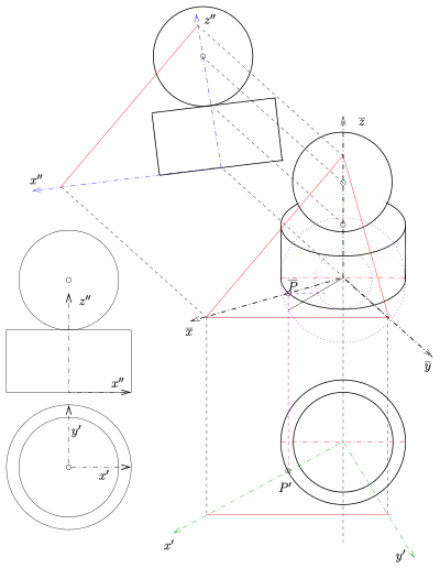 - Selecciónense las direcciones de los 3 ejes de coordenadas (no todos colineales) en el plano del dibujo ().