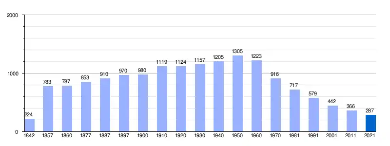 Gráfica de evolución demográfica de Ayoó de Vidriales[13] entre 1842 y 2021 |