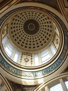 Encima de la escalera, la cúpula se eleva sobre cuatro pechinas hasta una altura de 32 metros y su interior es casetonado. Alrededor de la base de la cúpula está inscrito el lema de Liverpool, «Deus Nobis Haec Otia Fecit», y en las pechinas hay pinturas de 1902 de Charles Wellington Furse que representan escenas de trabajo portuario.[15][16]