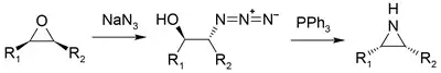 Implica una reacción en cascada que incluye la apertura del anillo de un epóxido con azida de sodio para formar un α-azidoalcohol. Este intermediario se hace reaccionar con trifenilfosfina, en donde se reduce la azida orgánica y se forma dinitrógeno y la aziridina:[13]