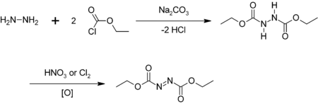 Aunque está disponible ampliamente en el mercado, el azodicarboxilato de dietilo puede ser preparado en el laboratorio. Una síntesis en dos pasos empieza a partir de la hidrazina, primero por alquilación con cloroformiato de etilo, seguido por tratamiento del hidrazodicarboxilato de dietilo con cloro[1] o ácido nítrico fumante rojo:[2]