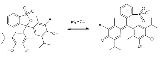 El azul de bromotimol actúa como un ácido débil en solución. Por lo tanto puede presentarse en su forma protonada o deprotonada, amarilla y azul, respectivamente.
