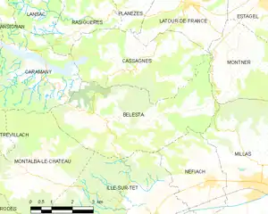 - Localización de Bélesta en un mapa de Francia y comunas limítrofes (enlace roto disponible en Internet Archive; véase el historial, la primera versión y la última).