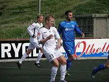 Jugadores del B36 (de blanco) en un juego ante el FC Suðuroy por la Vodafonedeildin del 2010. El número 23 es Hjalgrím Elttør, el número 11 es Christian Mouritsen.