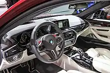 En el interior, los cinturones de seguridad negros vienen con un discreto patrón con líneas en los colores de BMW M GmbH, además de alfombrillas con la trama específica del modelo, así como el logotipo "M5", apuntan al carácter exclusivo. Otro identificador distintivo es el gráfico "M Competition" que aparece en el cuadro de instrumentos para dar la bienvenida al conductor mientras se lleva a cabo el arranque.[50]