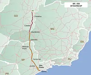 Entre el Distrito Federal y Luziânia, pasando por Cristalina, BR-050 se superpone a BR-040, que, a su vez, conecta Brasilia con Río de Janeiro.