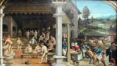 - Sistema de baños. Había una (o varias) bañera grande de madera usada de forma comunitaria. Tapando la bañera había una especie de tienda o mariposa que mantenía el calor y limitaba las corrientes de aire. En muchos casos había agua caliente, calentada con leña y servida con cubos.[37] [38]