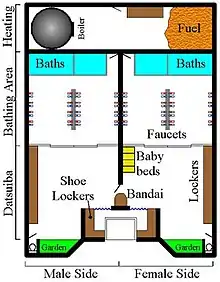 La primera noticia de unos baños públicos en Japón data del 1266. [2] El primer centro de estilo moderno destinado al baño (sentō en japonés) fue establecido en Edo (la actual Tokio) en 1591. [2] Los primeros baños de vapor eran del tipo iwaburo (岩風呂 "balsas de rocas") o kamaburo (釜風呂 "baños de horno"). Los nombres indicaban el aprovechamiento de cavidades o cuevas naturales o la construcción de refugios con piedras. Dentro de cada recinto, algunas rocas calentaban con leña y se derramaba agua encima, produciendo vapor. [10] [11]