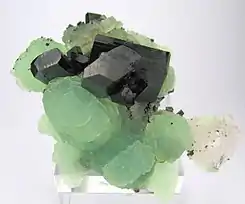 Usualmente se encuentran en agregados granulares dispersos sobre la superficie de minerales como el cuarzo, la prehnita, la apofilita o sobre rocas como gneis o basaltos. Sus cristales son prismáticos y cortos, de caras estriadas bien definidos y de un intenso color negro.