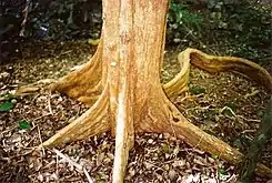 La corteza es gris o de color gamuza, rugosa con las fibras cortas, finamente agrietada en forma vertical, mudándola en escamas estrechas. La estructura de la corteza parece consistir de numerosas capas, las cuales llegan a ser más suaves y más parecidas al papel conforme se acerca al interior.